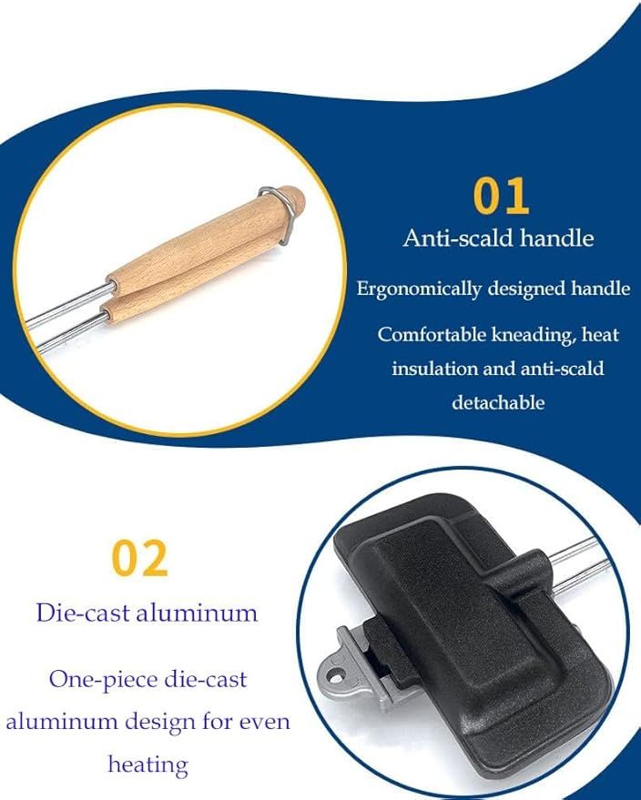 • Easy To Use Ergonomic Design -- Two handles can be locked for cooking, the design of the pie iron stops the ingredients from falling out, unique corrugated edge ensure a firm crimp which making it handy to cook things that generally fall to pieces on a traditional skewer. Just Simply apply oil to the plate of this sandwich maker, place the bread, fill with your favorite ingredients, lock the handes and bake on the stove, the two-tone color design prevents wrong flipping when grilling.